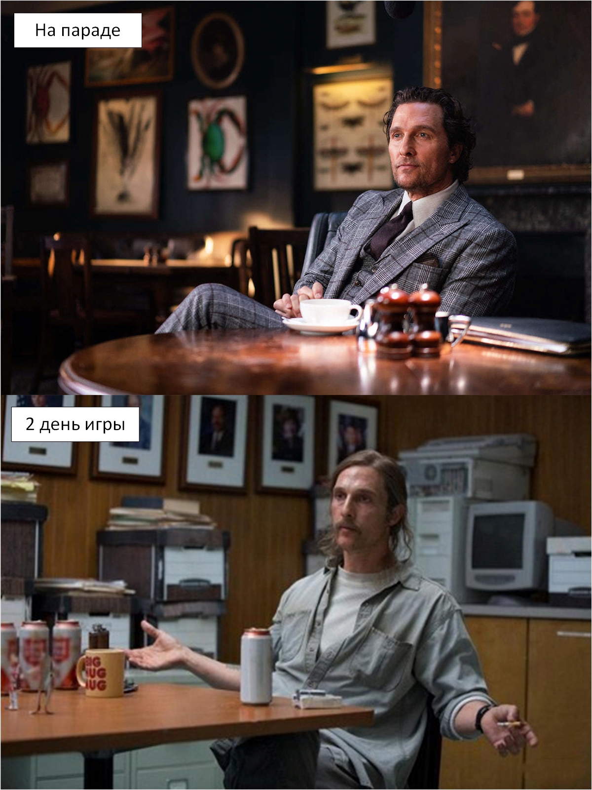 Самый животрепещущий вопрос, пожалуй. Да, на фотки я попал. Но почему я похож на Мэттью Макконахи, и не из «Джентльменов», а из «Тру детектива»? Я же был красивый и вообще отпадный. Штош.