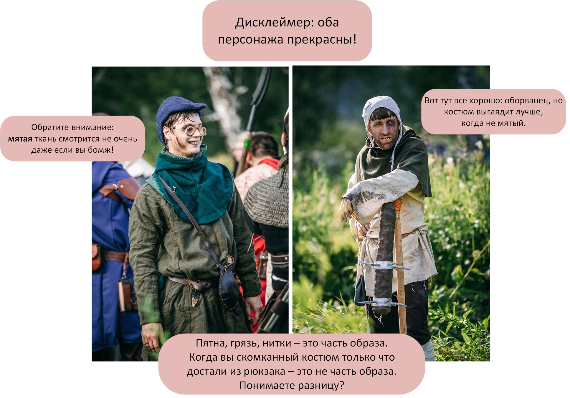 ✦ Обратите внимание, как вы костюм транспортируете на игру и как храните. Привезли отглаженный костюм в чехле на вешалке? Сохраните этот вид до конца игры, обращайтесь с ним аккуратно, снимая его после долгого игрового дня. Нет ничего хуже мятого красивого костюма (только мятый уродливый костюм). Фотоаппарат — не утюг, увы.